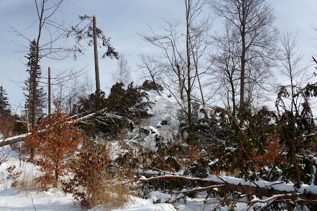 Dostępu do skał na szczycie wzniesienia zagradzały nam powalone drzewa i dotarcie do nich